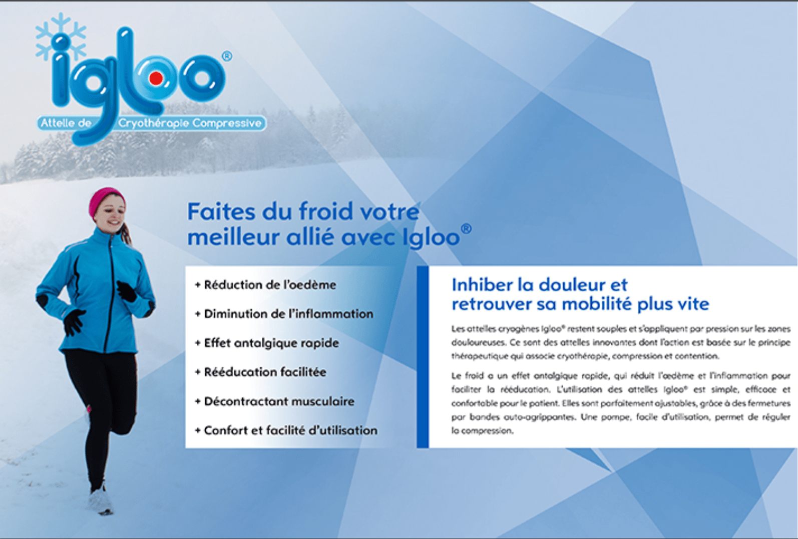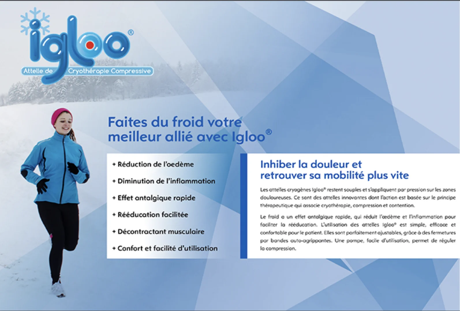 Simples d’utilisation, confortables et très efficaces, les attelles cryogéniques Igloo® bénéficient de technologies innovantes associant cryothérapie, compression et contention.