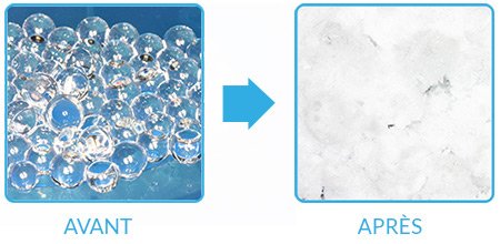 Notre formule brevetée Freezsnow® restitue un FROID DE NEIGE grâce à la transformation des billes de gel en cristaux de neige.